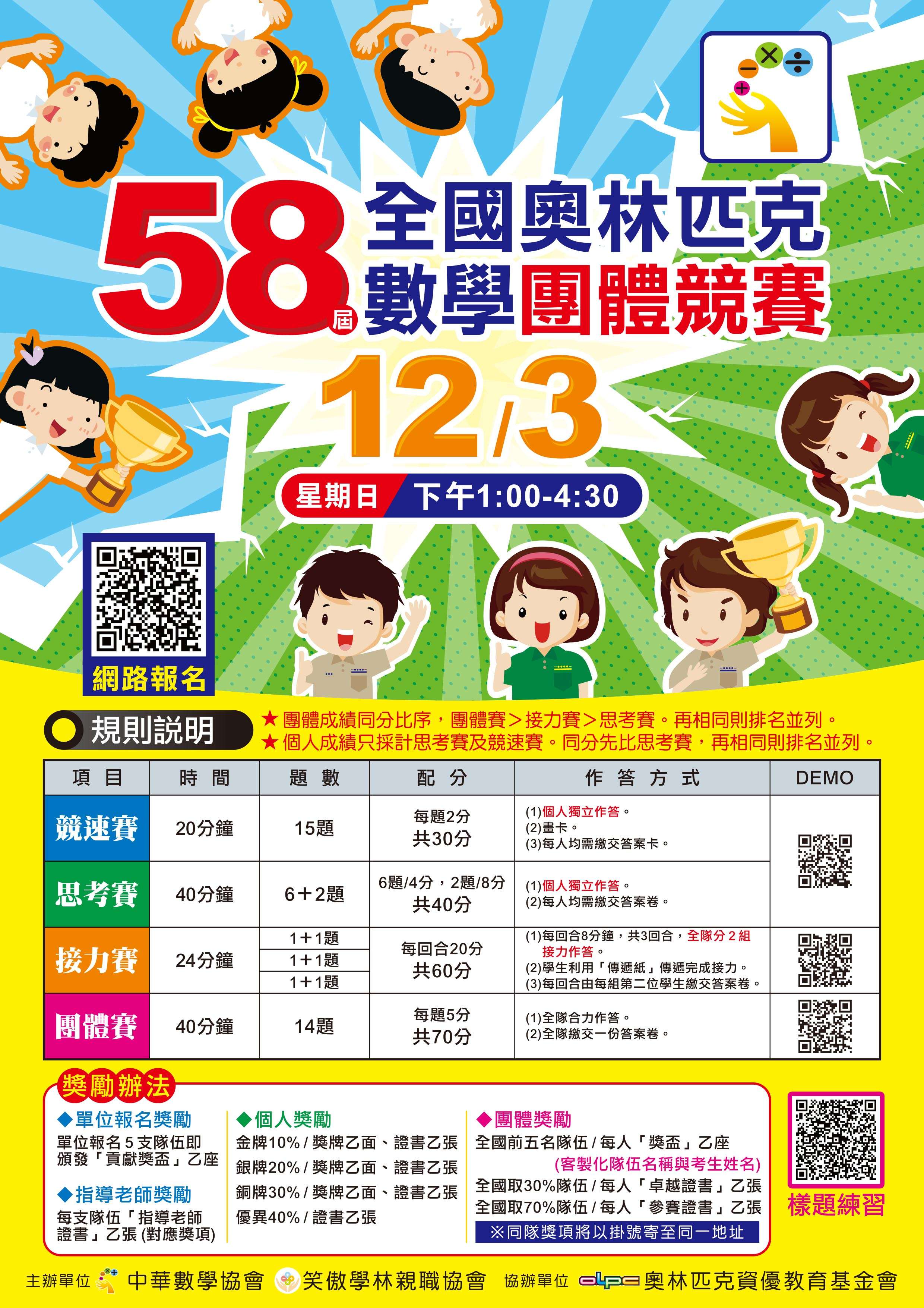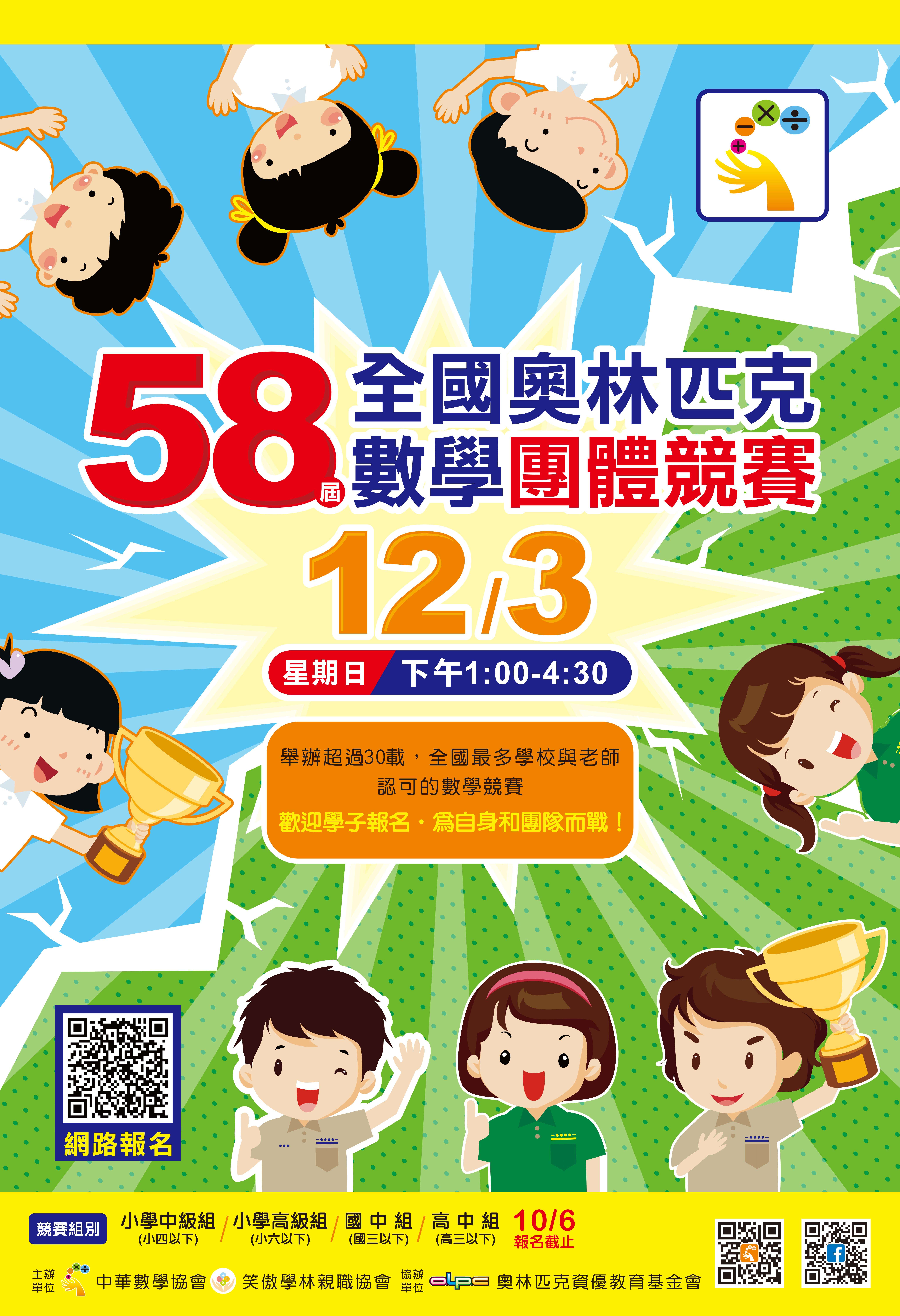 一、中華數學協會為推廣國小、國中至高中之數學教育,謹訂於112年12月3日(日)舉辦 「第58屆全國奧林匹克數學團體競賽」,旨在培養學童對數學的興趣,為國家培育優秀人才。鼓勵學生參加競賽,以提升數學教育,歡迎共襄盛舉。