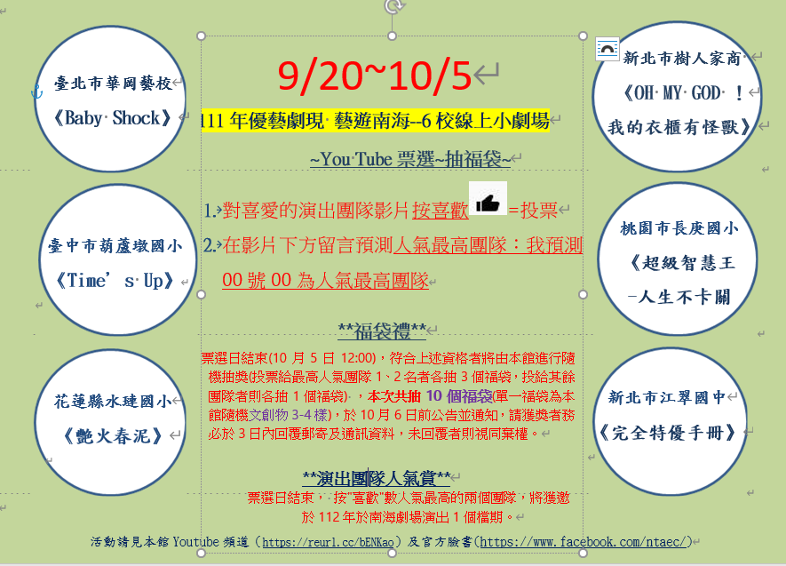 111年度表演藝術類競賽因嚴重特殊傳染性肺炎無法現場聆 賞,國立臺灣藝術教育館(下稱藝教館)特地舉辦「優藝 劇現」創意戲劇比賽網路小劇場推廣活動,邀請創意戲劇 優秀團隊至該館南海劇場演出錄影,以網路播映方式,即 日起至111年10月5日止在藝教館官方臉書連結YouTube頻道 播出,歡迎民眾藉由線上平臺欣賞學生們創意優質戲劇。