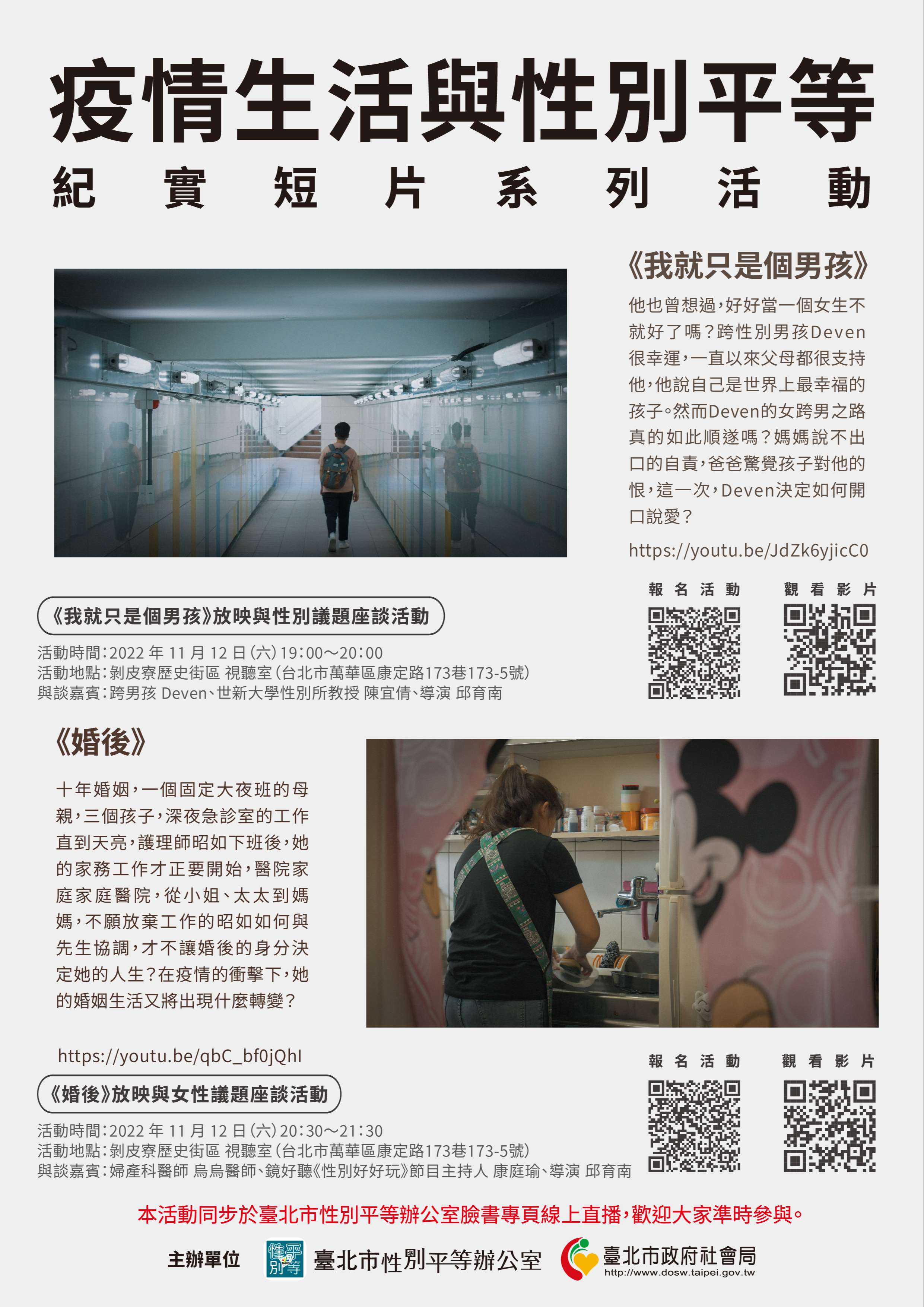 二、本市性別平等辦公室為擴展性平議題宣導之多元性與豐富性,本年度聚焦「疫情生活與性別平等」,分別製作《我就只是個男孩》及《婚後》2支紀實短片: