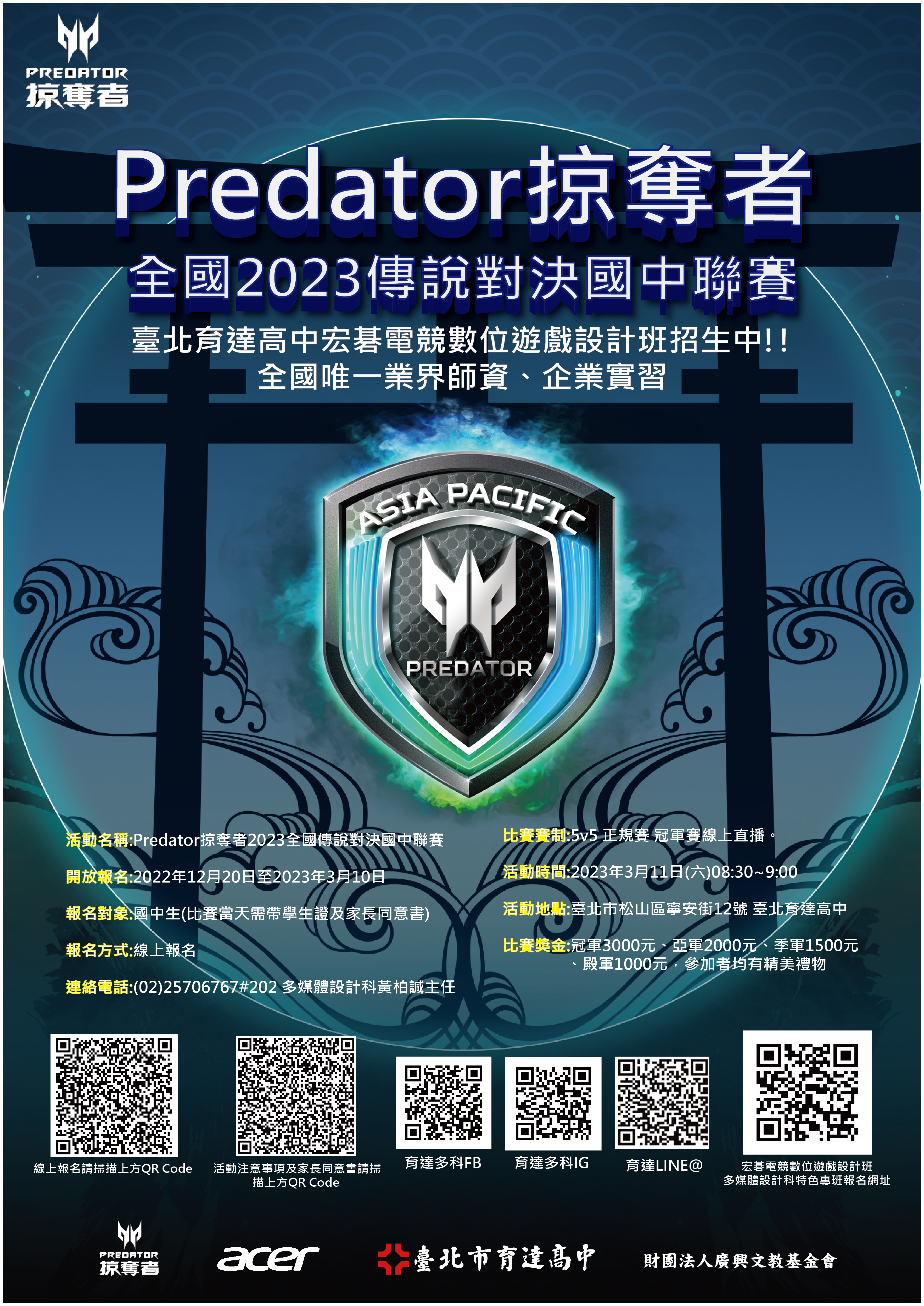 一、宏碁股份有限公司舉辦「Predator掠奪者全國2023傳說對 決國中聯賽」,定於2023年3月11日(星期六)比賽。