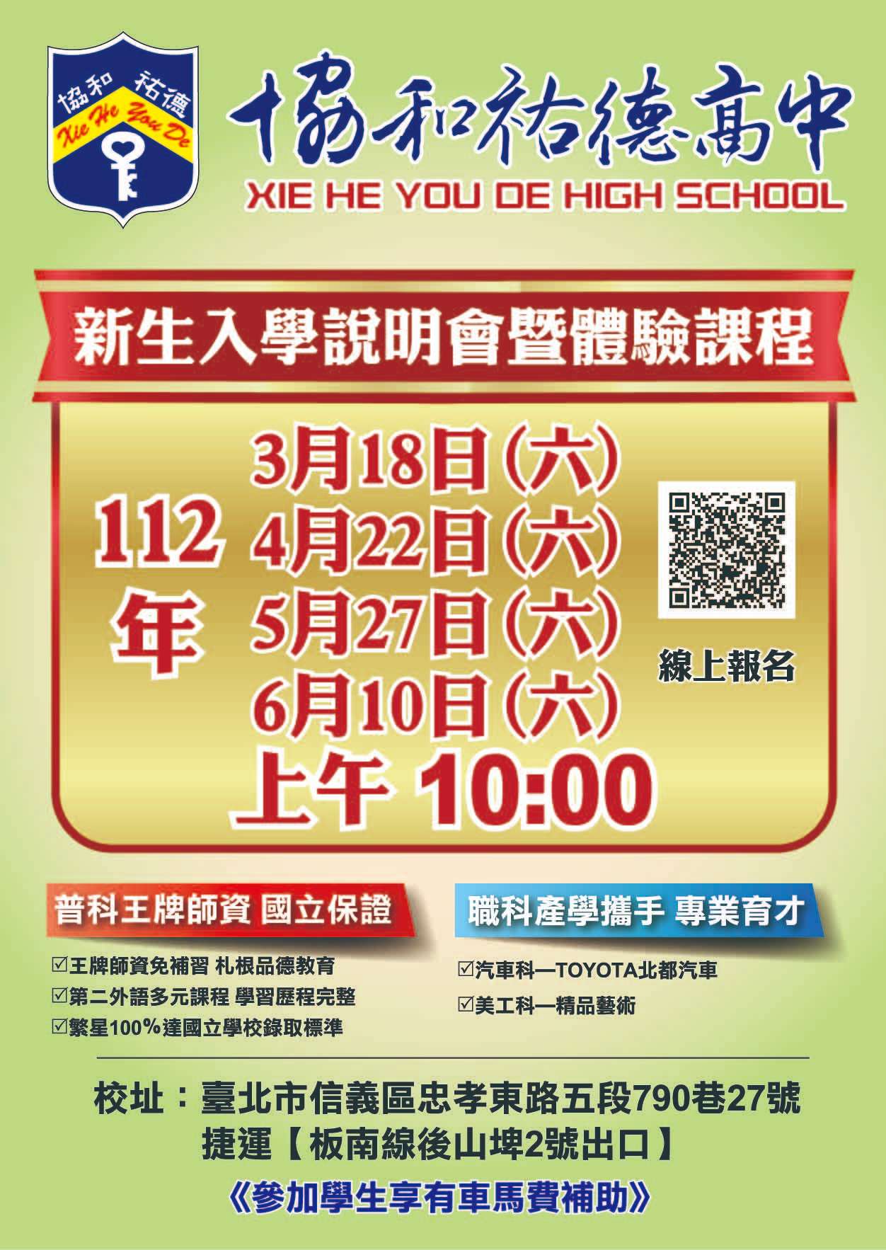 轉知 祐德高中「汽車科、美工科-技職特色、體驗課程;普通科-升學進路、教學特色、體驗課程」說明會