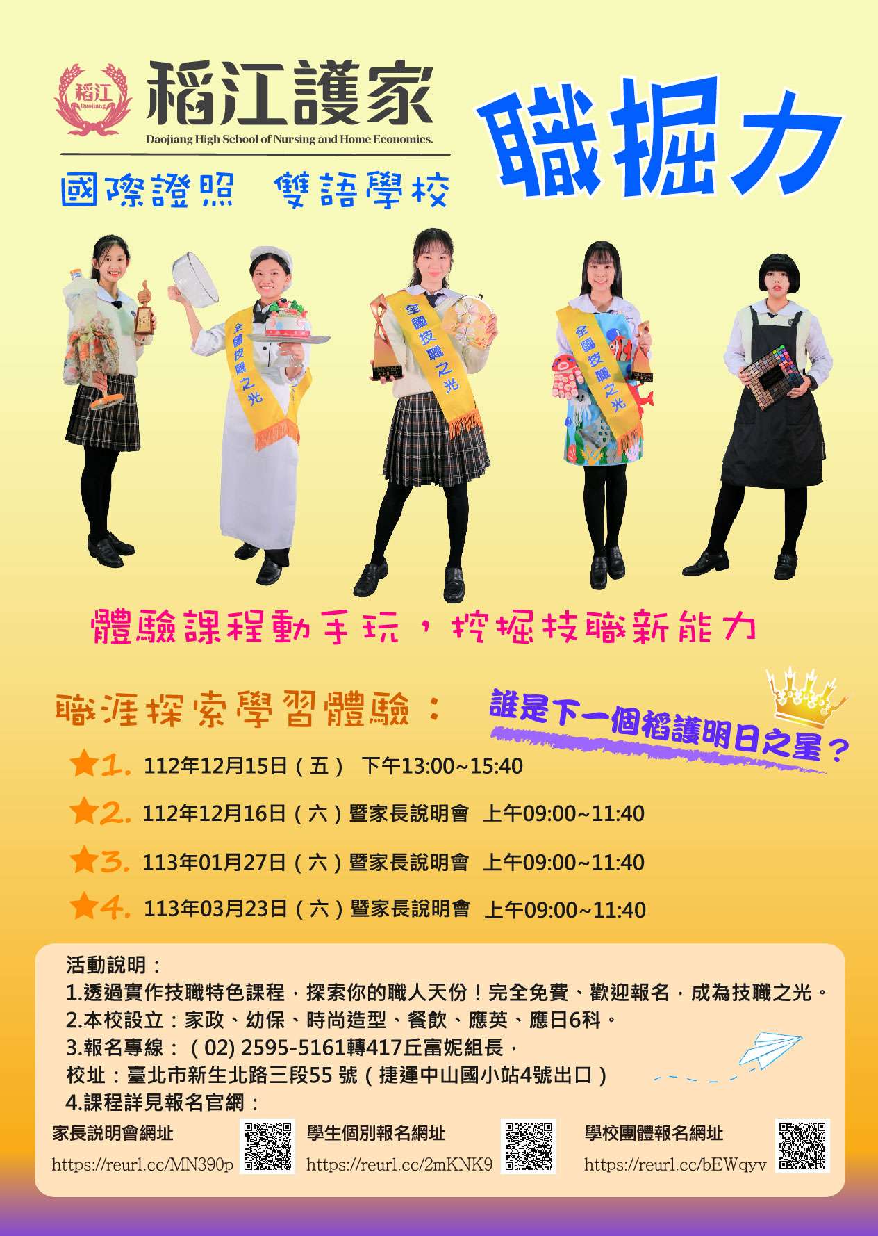 二、本學期於112年12月15日(五)、12月16日(六)、113年1月27日(六)、113年3月23日(六)辦理「稻江護家職掘力實作體驗」,誠摯邀請 八、九年級學生參加,並歡迎教師或學生家長共同參與。