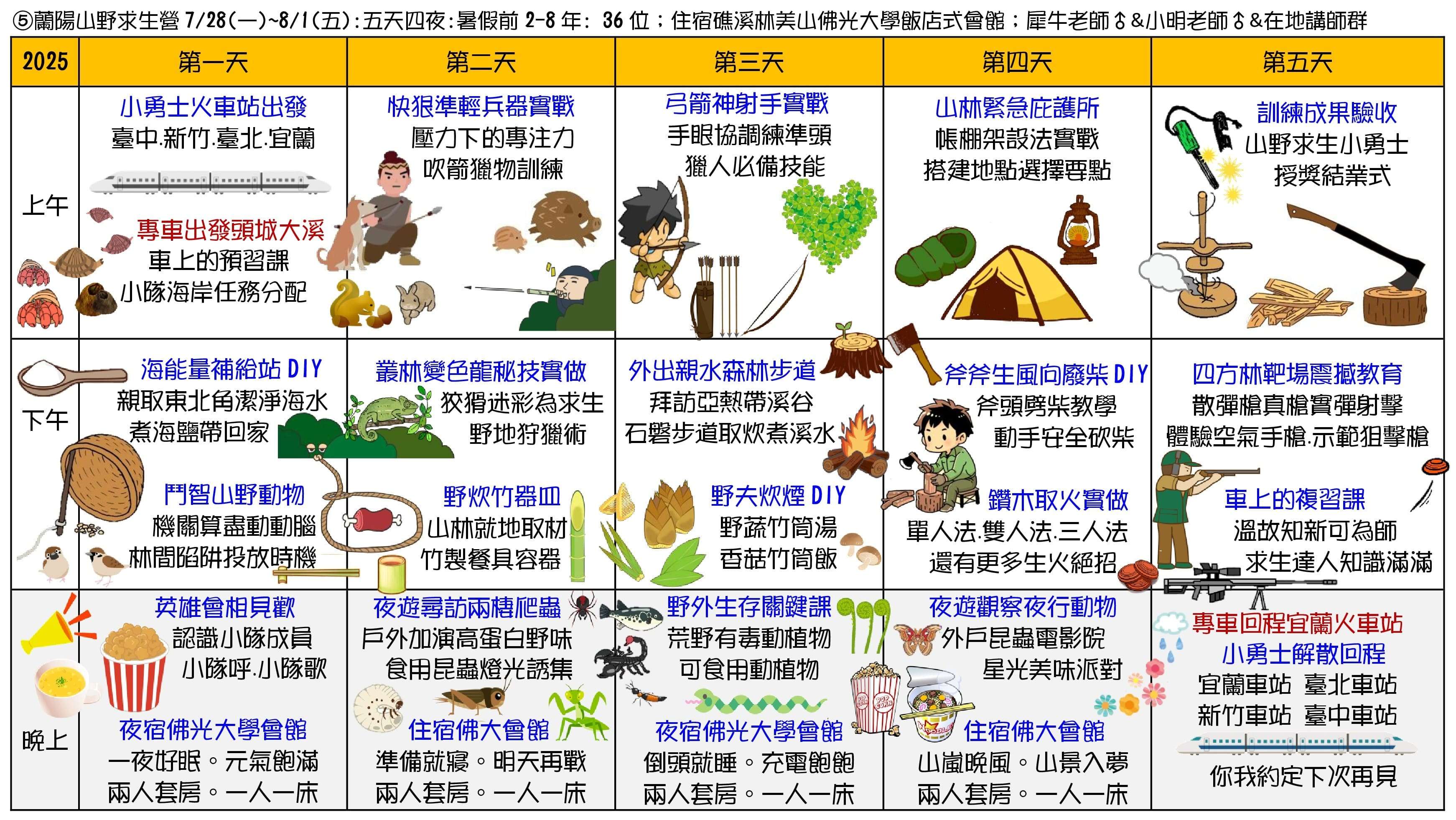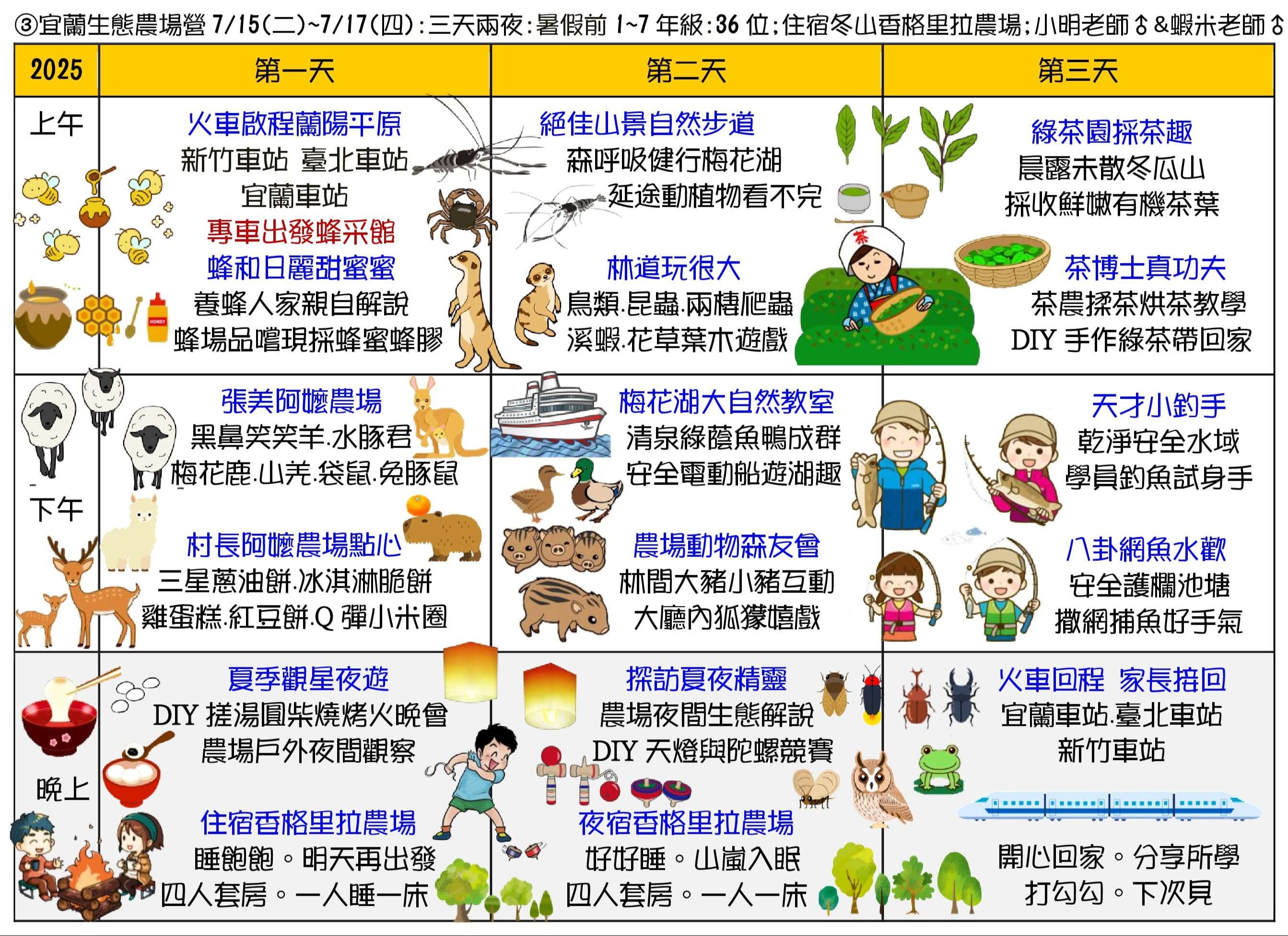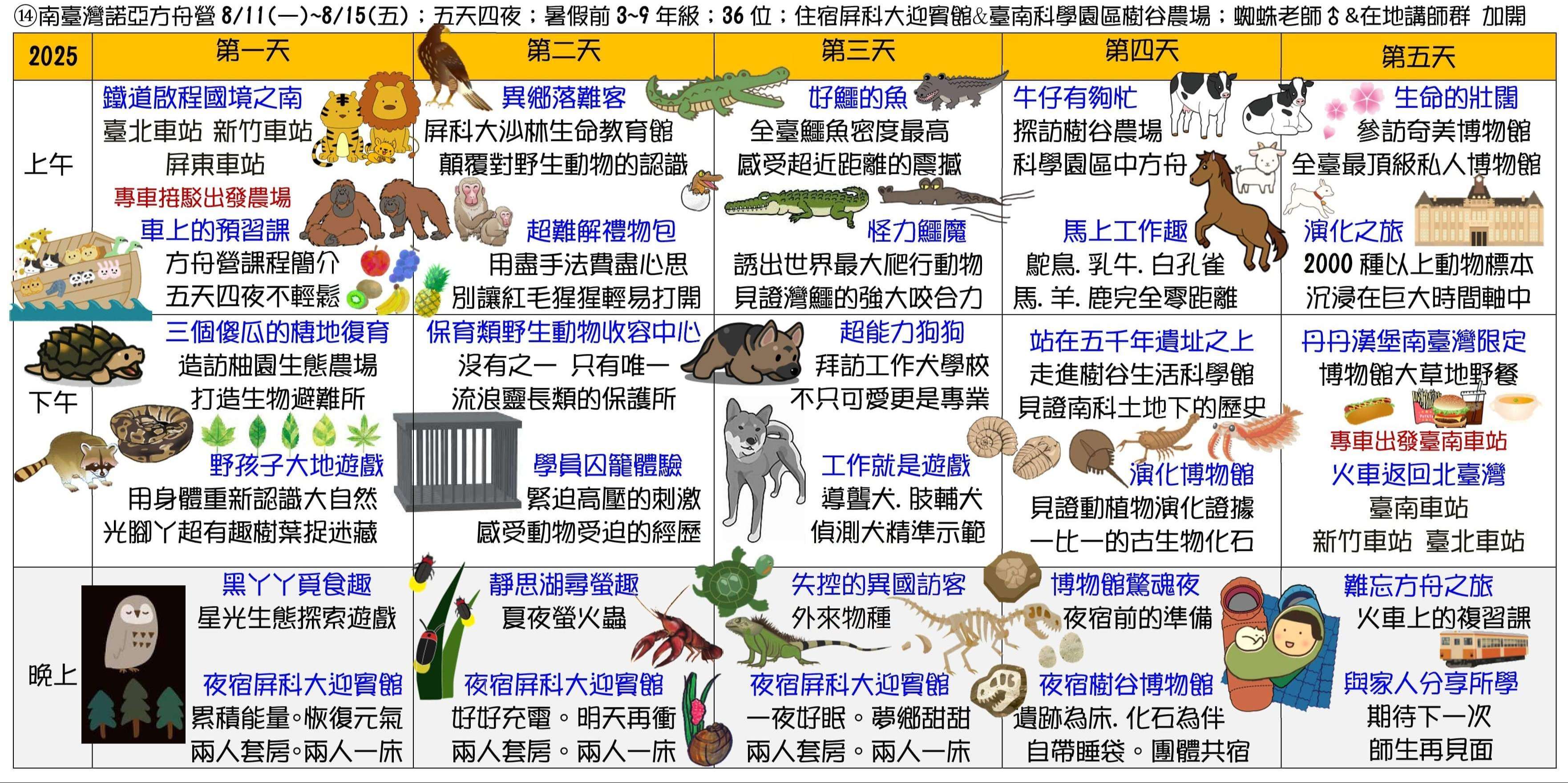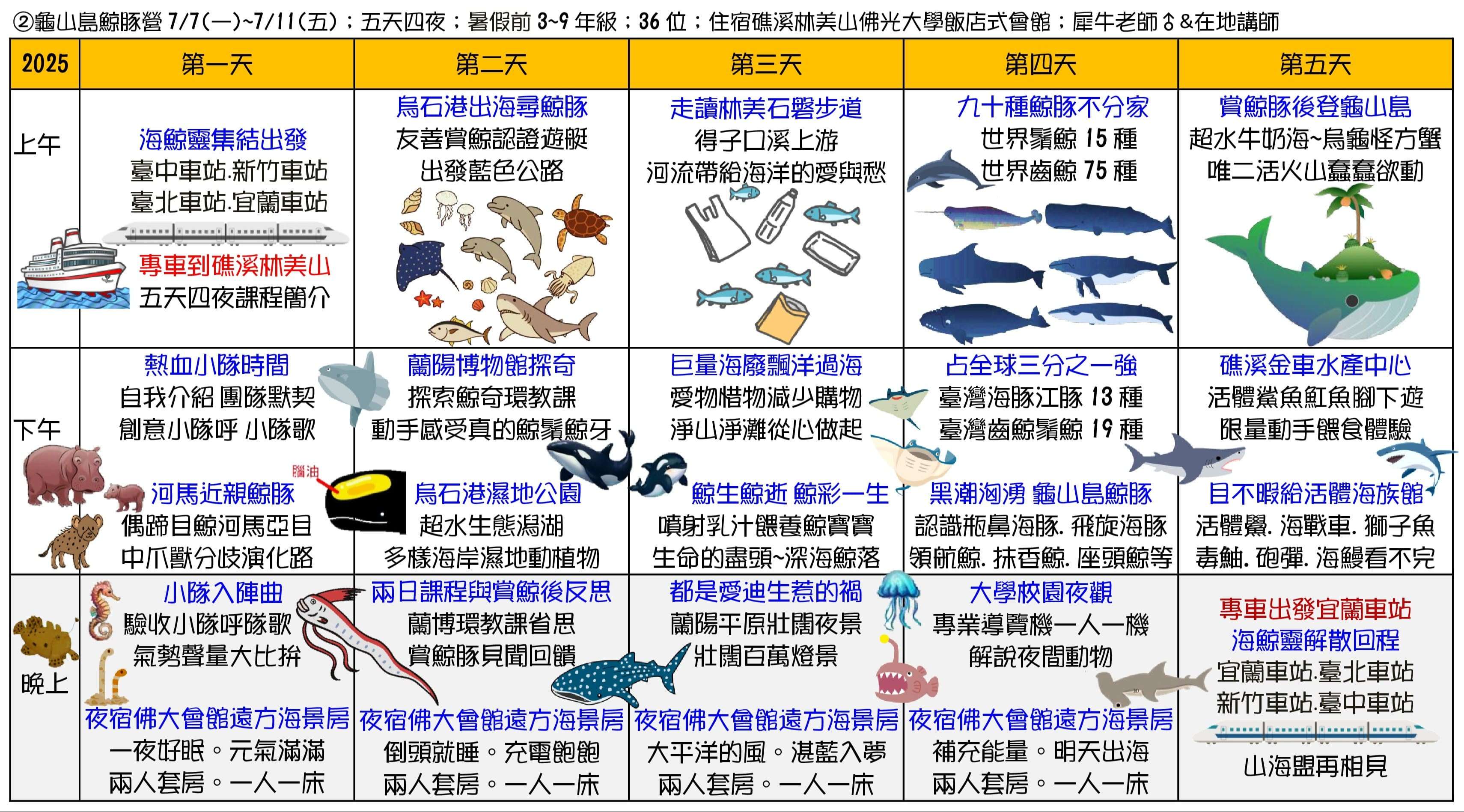 課程主題:①噶瑪蘭昆蟲營②龜山島鯨豚營③宜蘭生態農場營④南臺灣諾亞方舟營⑤蘭陽山野求生營⑥貓頭鷹飛羽營⑦甲蟲營⑧綠世界六足昆蟲營⑨滿月圓森林營⑩東北角漁村營⑪池上單車營共十三梯次過夜與非過夜營隊。