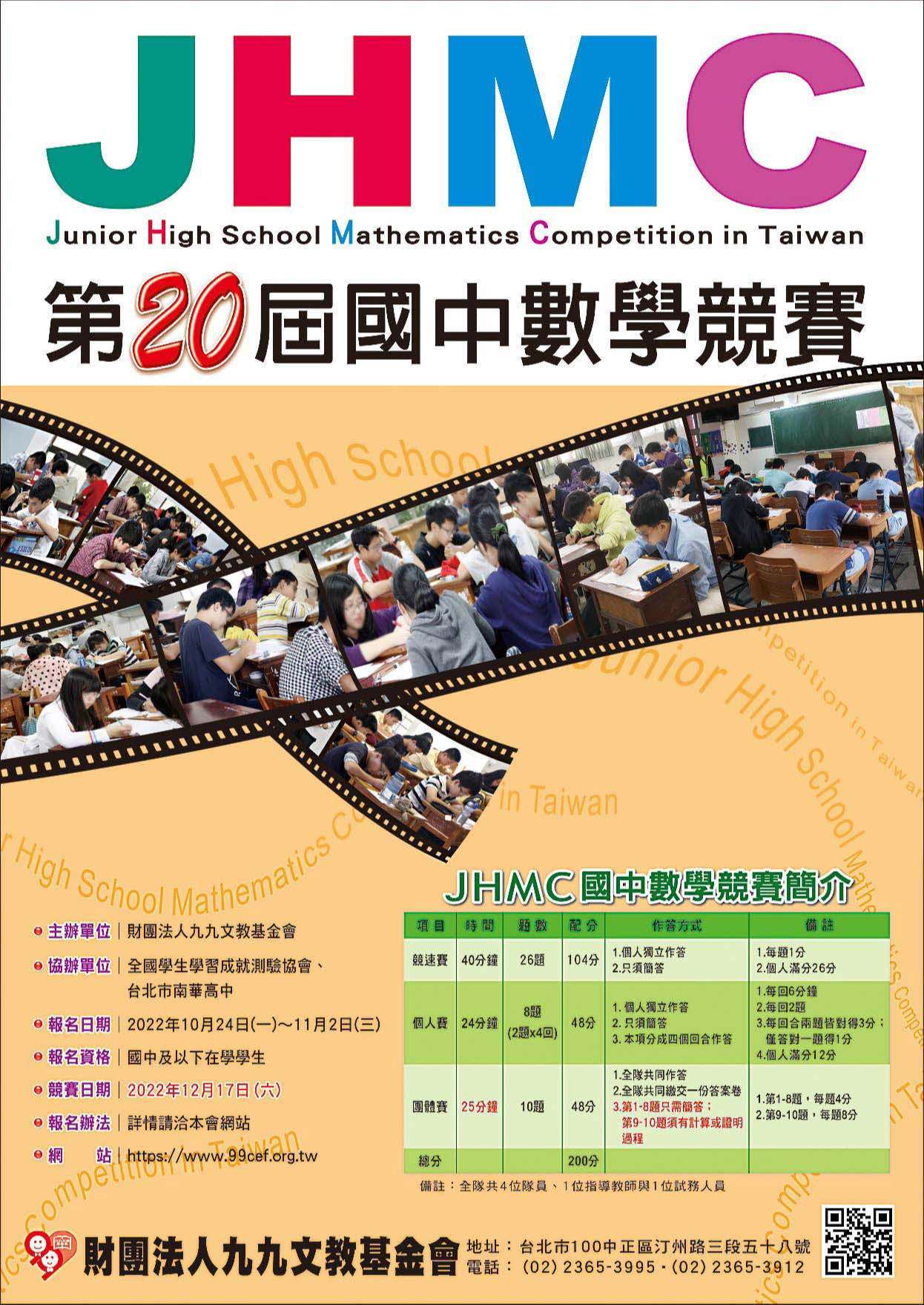 財團法人九九文教基金會訂於2022年12月17日(星期六)舉辦第20屆JHMC國中數學競賽。