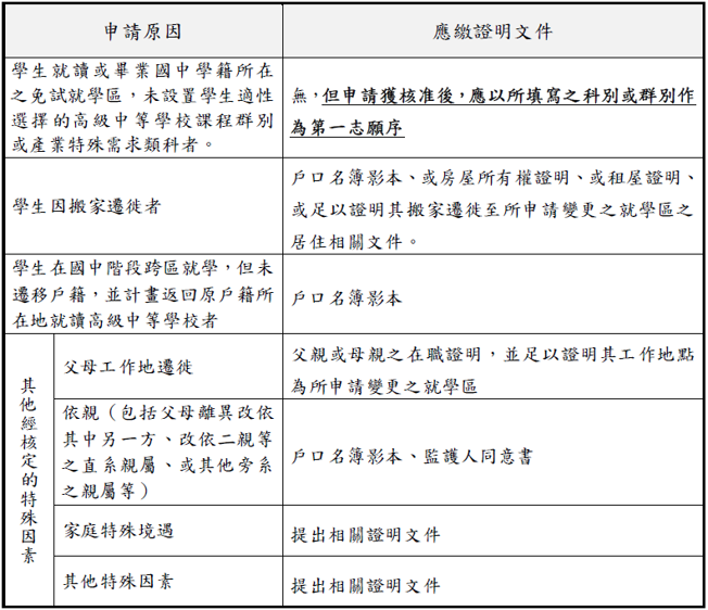 1.欲至北北基三市以外縣市就讀高中職,必須申請變更就學區並經審核通過後,才能個別報名該區免試入學分發作業。