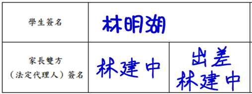 以正楷簽寫中文全名。報名志願表務必家長雙方簽名,若有特殊原因(如父母離異、出差、出國…等),請於簽名欄位敘明理由並簽名。