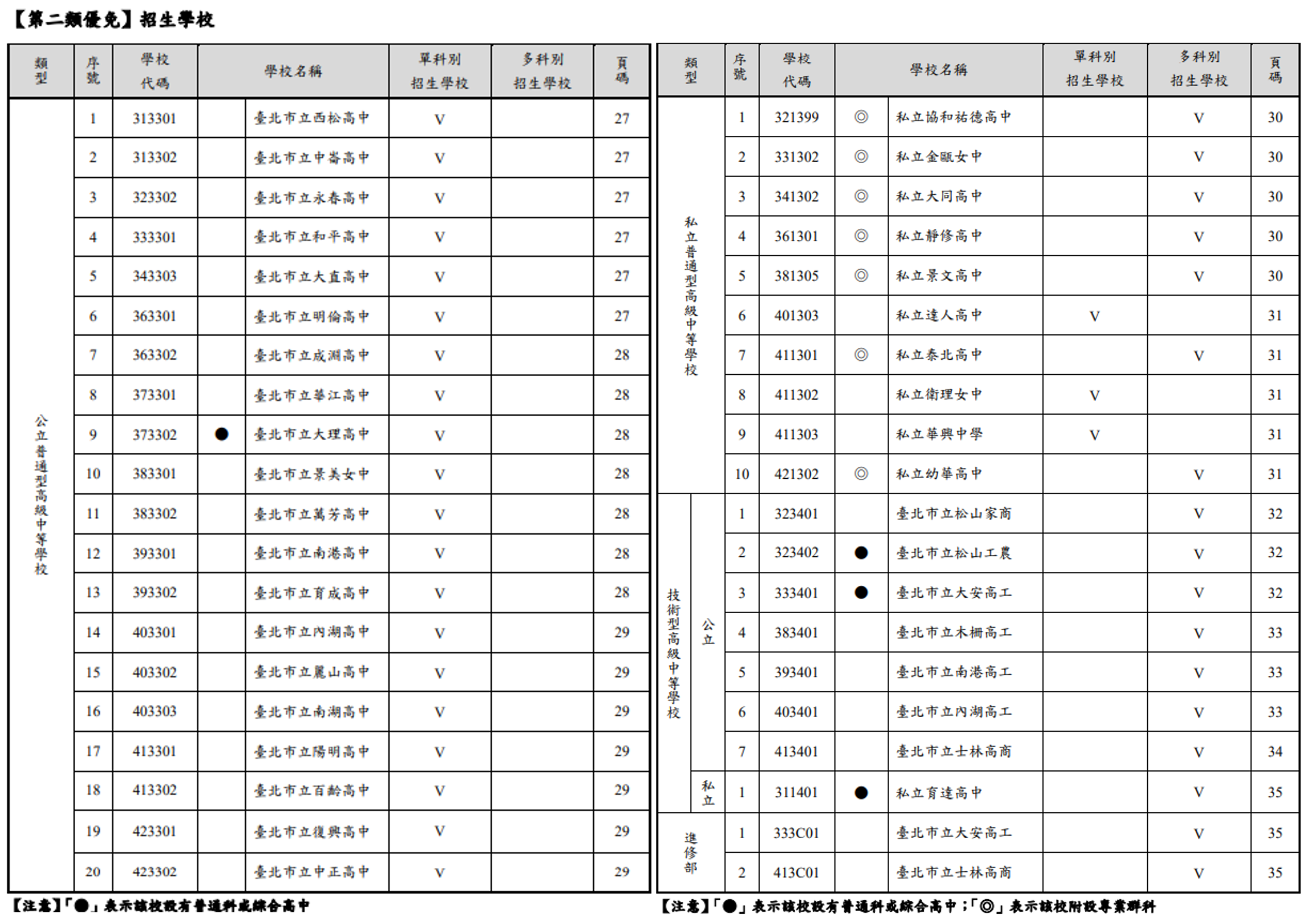 臺北市114學年度高級中等學校優先免試入學【第二類優免】招生學校