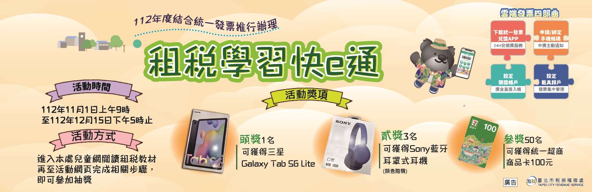 (二)活動內容:國中、國小學生於活動期間至「臺北市稅捐稽徵處兒童網」觀看租稅教育動畫或漫畫,將閱讀情形拍照上傳活動網頁,並正確回答租稅問題,就有機會獲三星Galaxy TabS6 Lite、Sony藍牙耳罩式耳機及統一超商商品卡100元等多項好禮!