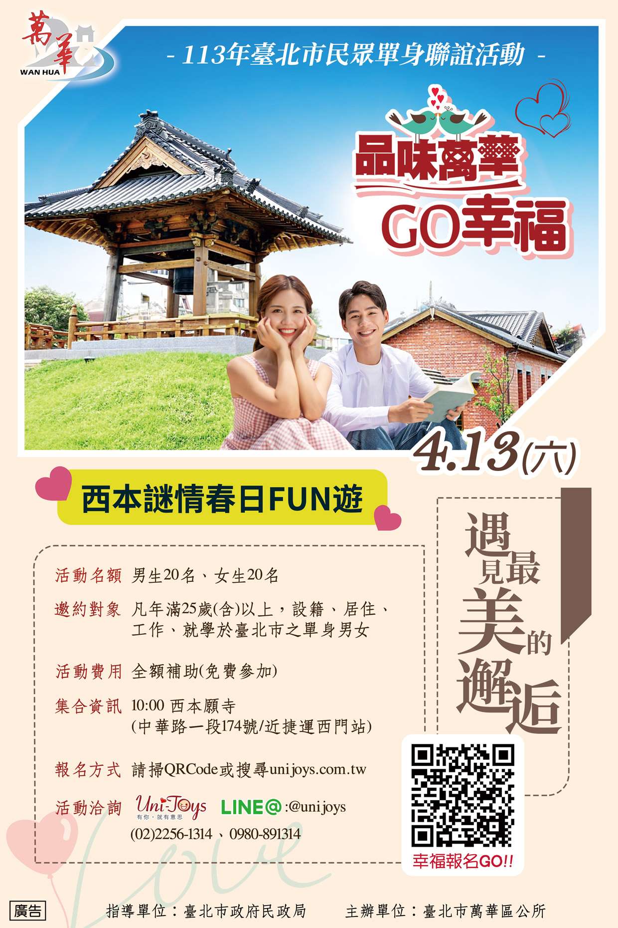 臺北市萬華區公所113年度單身聯誼活動,將於113年4月 13日(星期六)上午10時至下午4時時假『臺北市天后宮、 西本願寺、西門町商圈』舉辦,線上報名時間自即日起至 113年4月5日(星期五)或額滿為止,凡年滿25歲以上,在 臺北市居住、工作或就學,並且有穩定工作(以萬華區者優先錄取),總計40個名額,男女各20人,免費參加,活動詳情請見萬華區公所官網或電洽2306-4468轉204陸先 生。