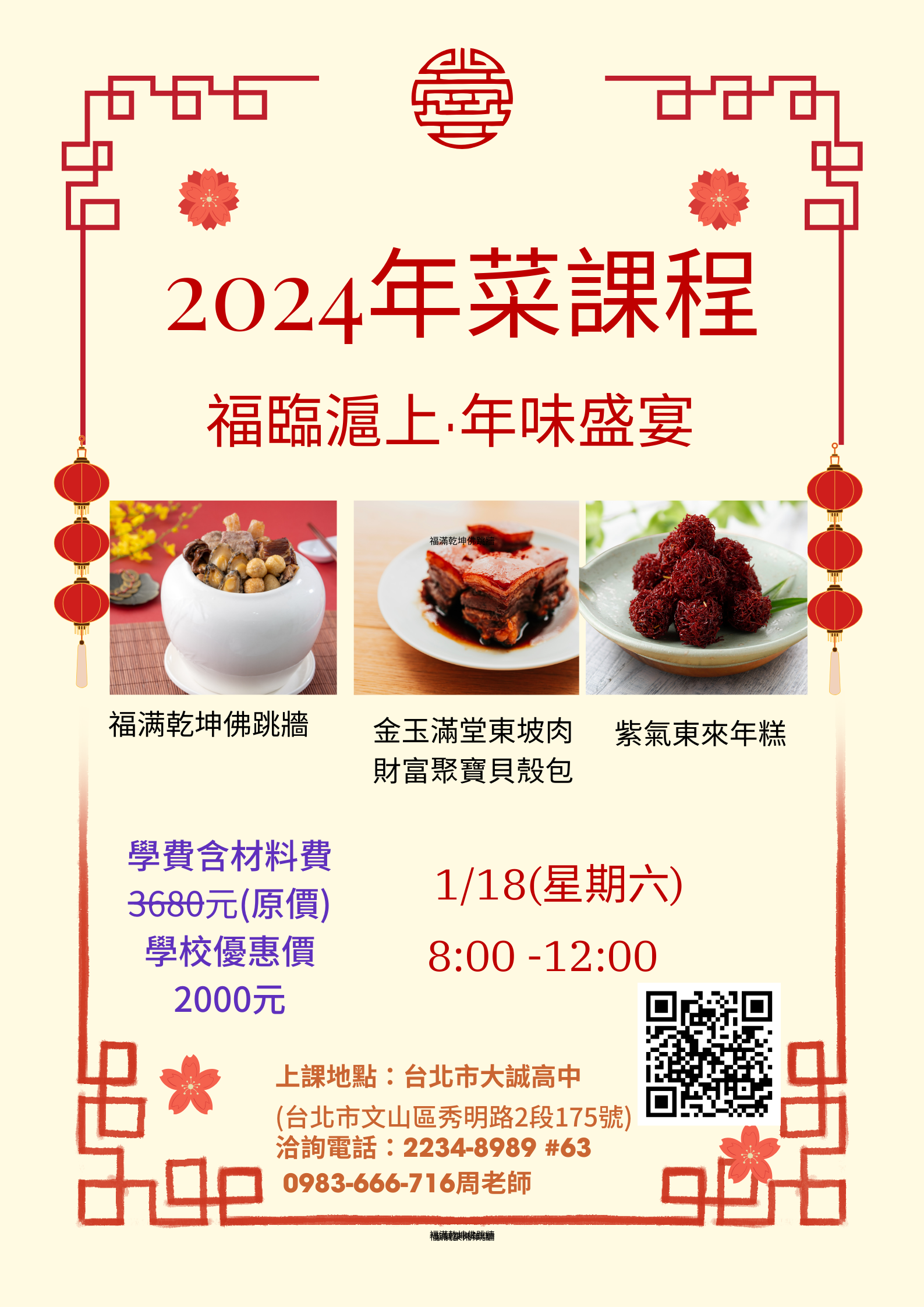 一、臺北市私立大誠高級中學推廣教育中心辦理【中餐烹調2024年菜】體驗課程,以傳統經典年菜為主,由本校餐飲科主任帶大家一起完成豐盛佳餚。
