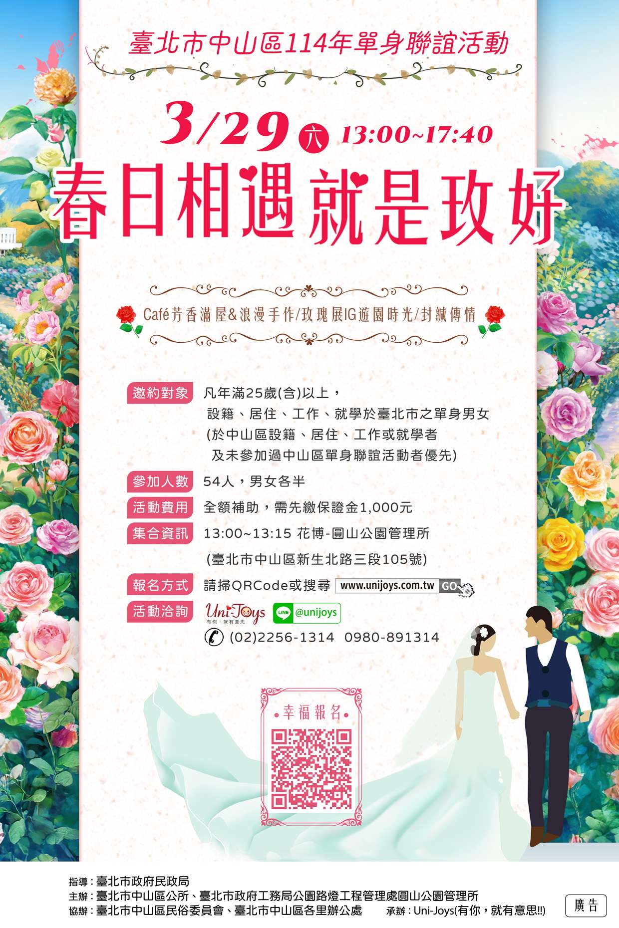 臺 北市中山區公所『春日相遇 就是玫好』單身聯誼活動,將 於114年3月29日(星期六)13時至17時40分假臺北玫瑰園 及花博新生園區舉辦,活動名額為男、女各27人,共54 人,歡迎年齡 25歲以上設籍於本市或於本市居住、工作、 就學之單身者踴躍報名參加(於中山區設籍、居住、工作或就學者及未參加過中山區單身聯誼活動者優先),活動 詳情請參閱本所官網(https://zsdo.gov. taipei/)或電 洽(02)25031369分機593鍾小姐。